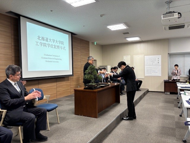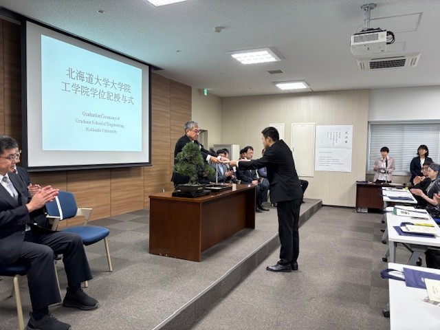 2人は2023年4月に北海道大学に研究生として来日し、2023年8月の大学院入試に合格して9月より修士課程に進みました。蒋君は定容燃焼容器を用いたe-fuelの燃焼評価を、劉君はバイガスのピストン圧縮改質研究を各々2年間研究し、今年5月に自動車技術会春季大会(横浜)で発表をし、7月の修士論文説明会を経て、無事に卒業することになりました。